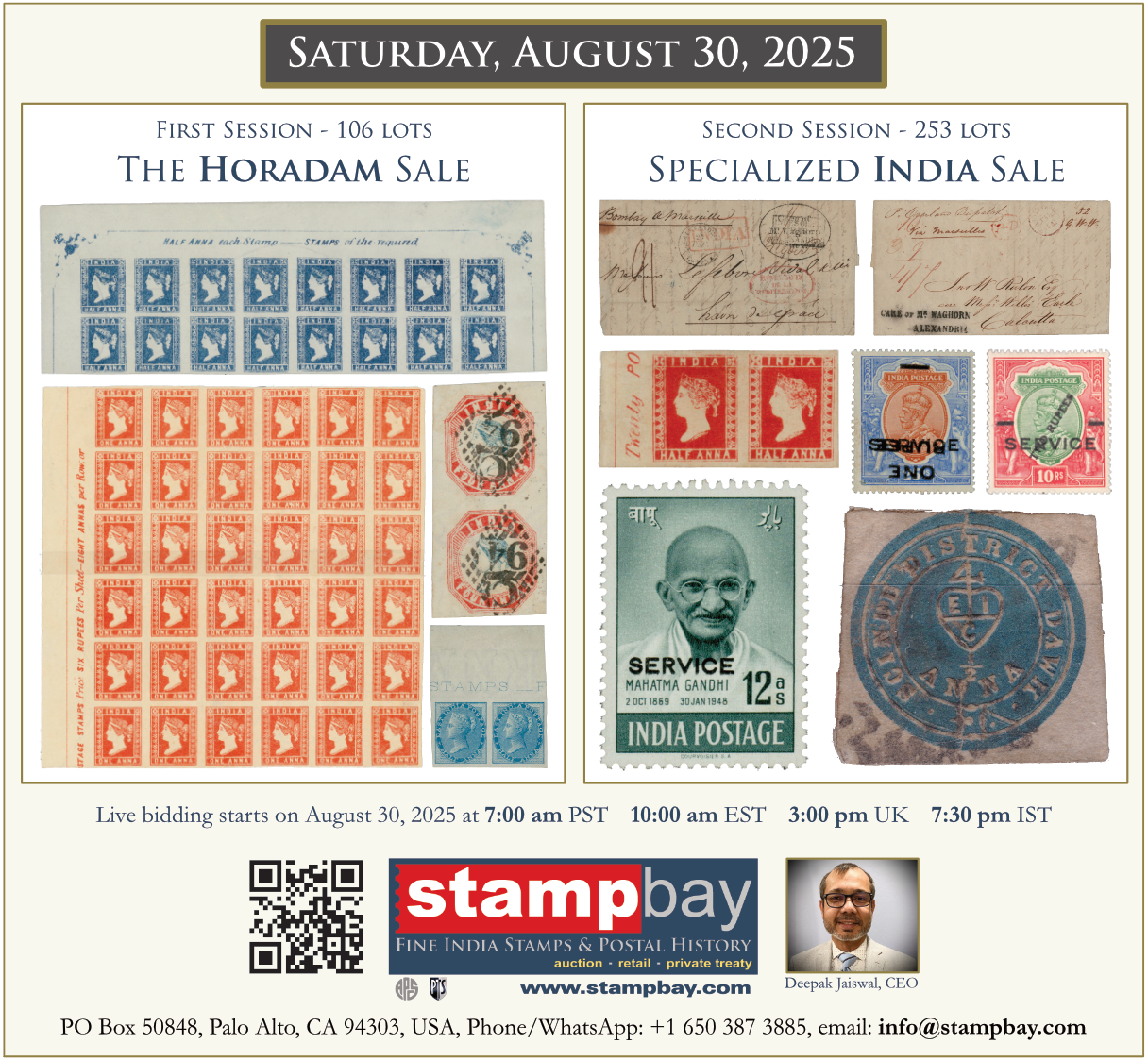 India 1890 (?) reprint of the 1854-55 4a blue and red (frame die II) with essay head, lithographic transfer in three rows of four, impressions spaced 18mm apart horizontally and 12-12½mm vertically (without wavy lines or rosettes), complete sheet of 12 (4×3) on medium white wove with ‘SPECIMEN’ underprints, pos. 12 with ‘head inverted’, Spence […]