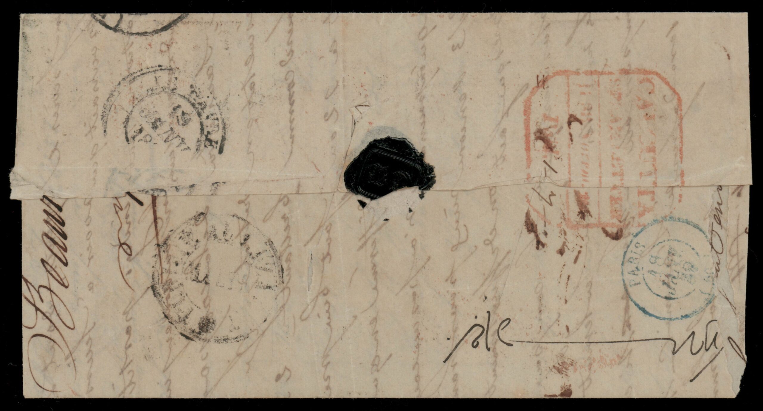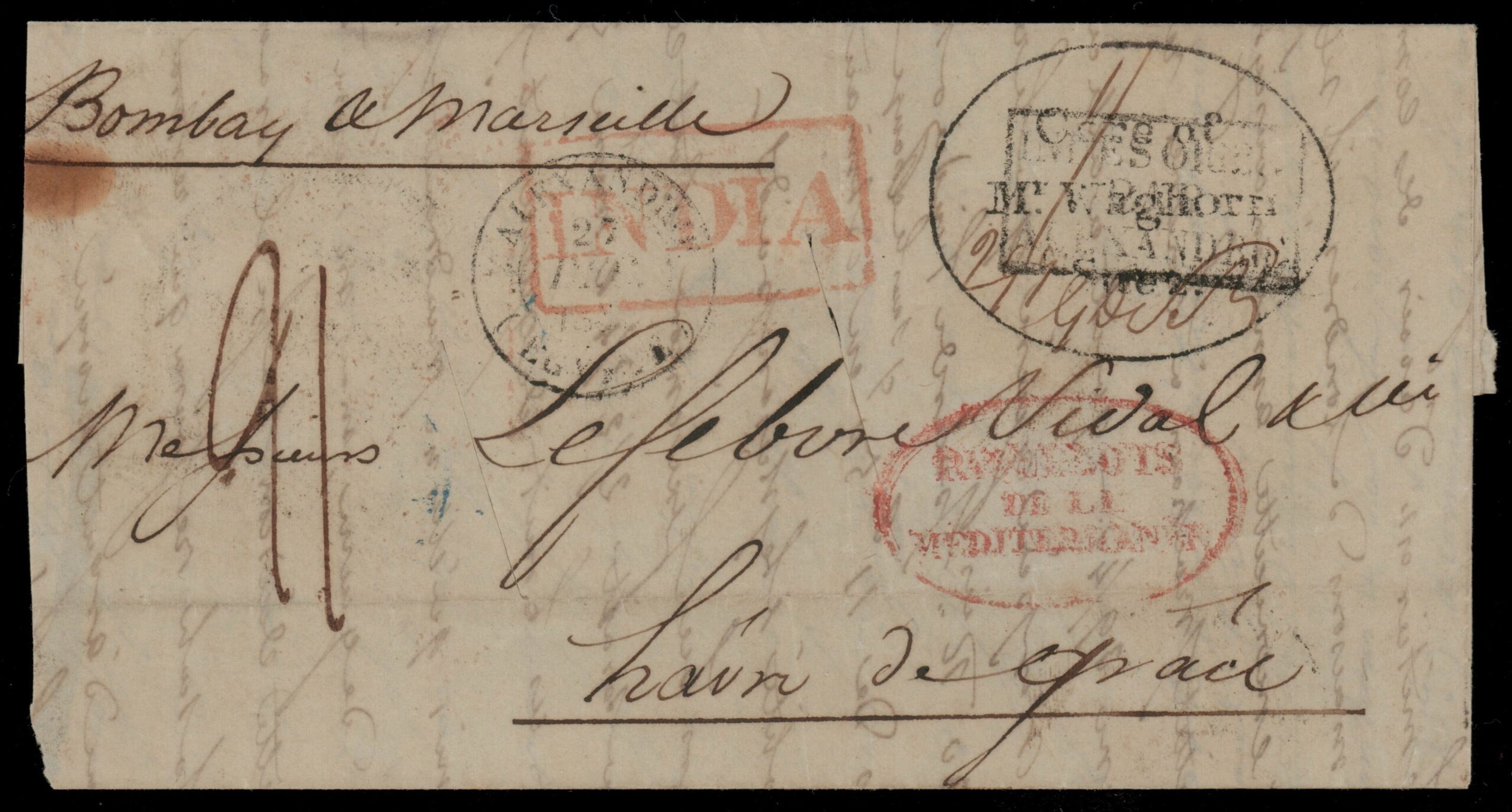 India 1838, “Care of Mr. Waghorn, Suez” (Sidebottom 3; Smith 3) complete and clear oval handstamp on large part of 1838 folded cover (missing interior page, side flap, and piece of bottom flap), to Havre, France, red Calcutta Steam Letter Nov. ?, 1838 boxed despatch datestamp with manuscript “1-7as” rate (1r7a) on back, sender’s directive “(via) Bombay & Marseille”, red boxed “INDIA”, “Indes Orien par Alexandrie”, “Purifie au Lazaret, Malte”, and red “Paquebots de la Mediterranee” handstamps, Alexandria Dec. 27 and Paris Jan. 18 (1839) transit and Havre Jan. 19 (1839) arrival datestamps, rated “21”, cover with disinfection slits and small toned spot at left